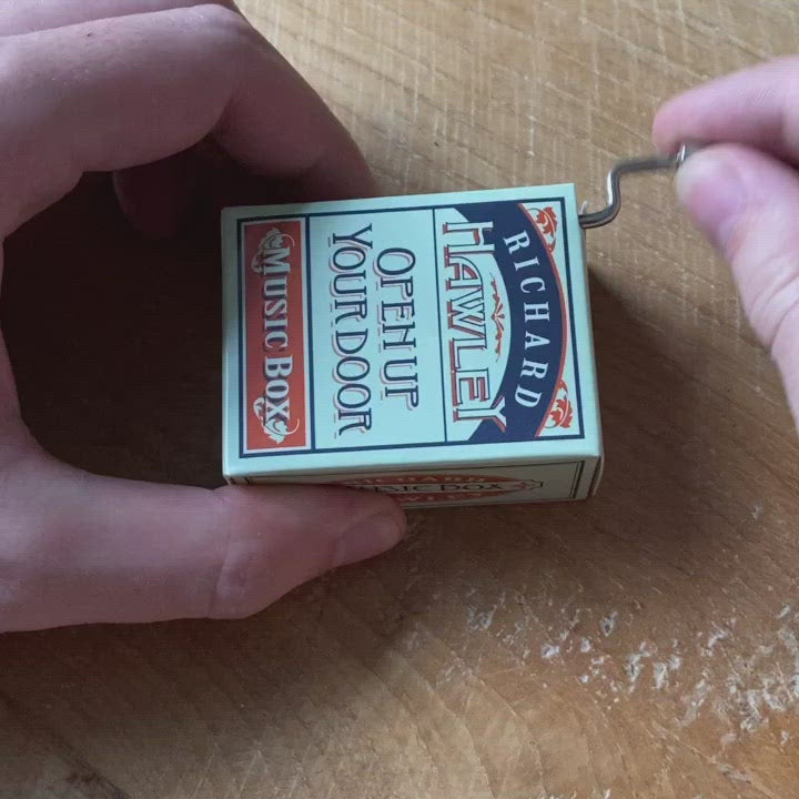 Hand cranked music box which plays a burst of Open Up Your Door.